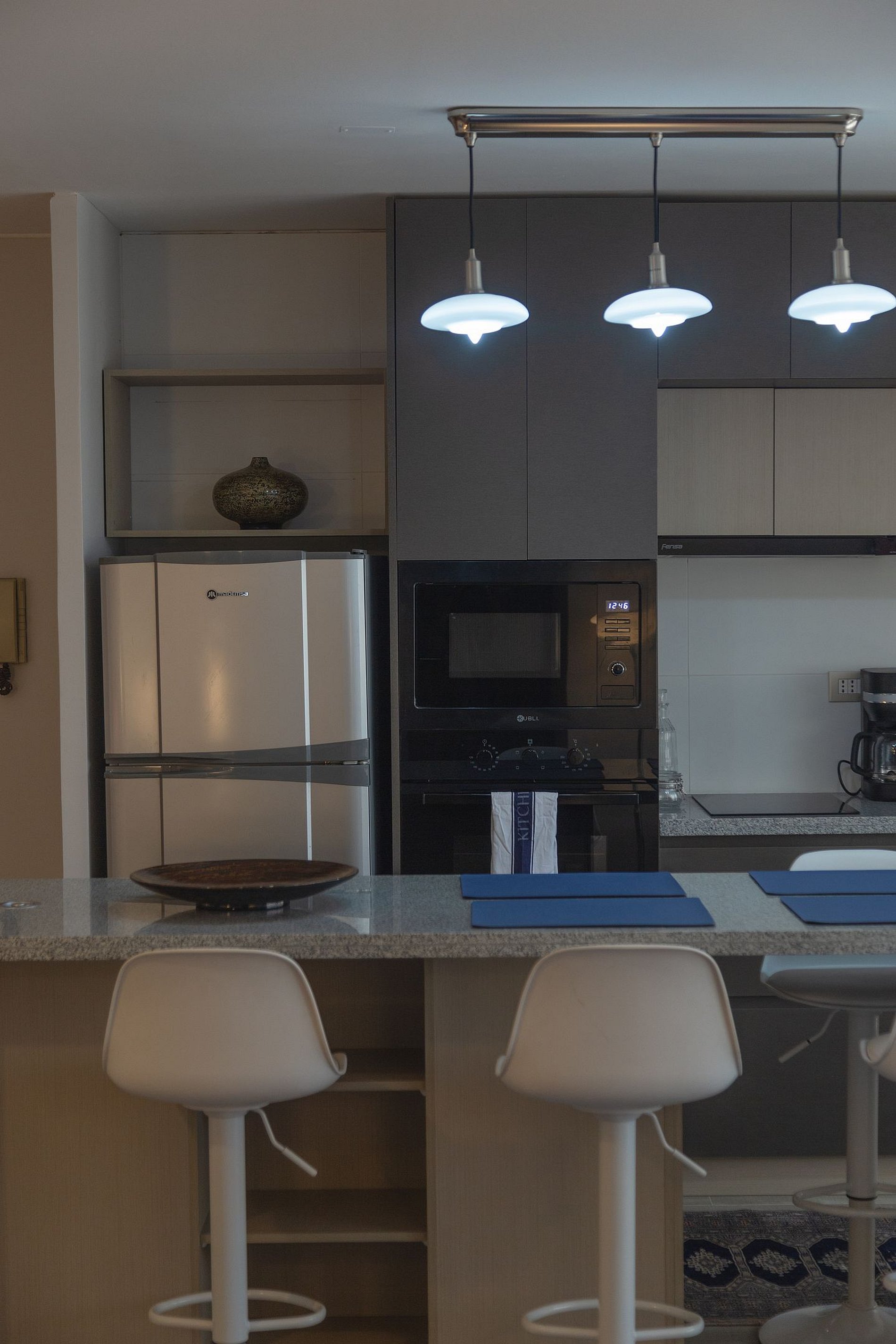 La cocina está completamente equipada con horno, microondas, frigobar, cafetera, hervidor y menaje completo.
